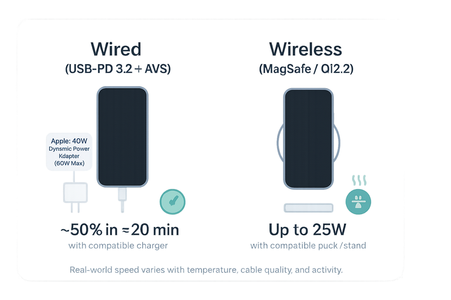 - Wireless: New MagSafe and Qi2.2 pads can reach up to 25W. Older pads work but usually at lower speeds.