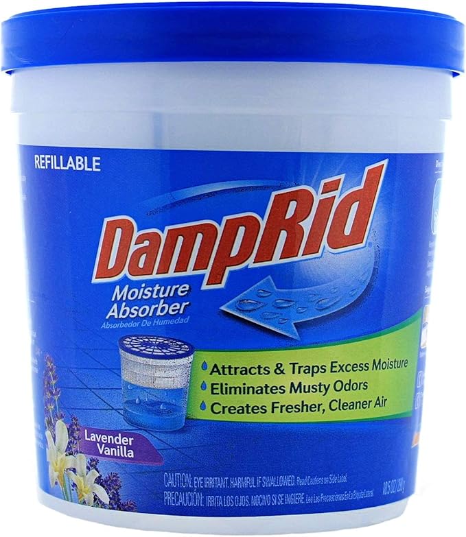 - DampRid Lavender Vanilla moisture absorber controls dampness and odors in spaces up to 250 sq ft. Lasts up to 45 days and is refillable with DampRid 42-oz refills.