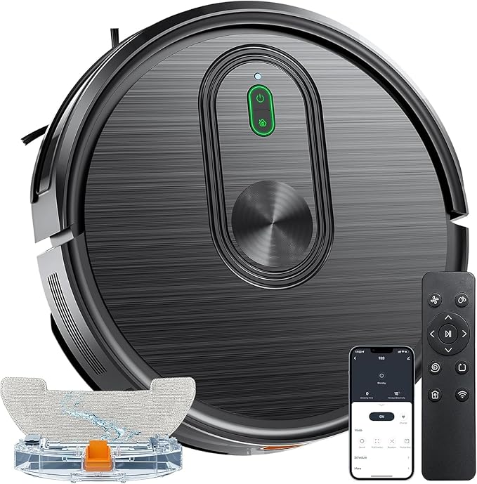 • Smart Tuya app, remote and Google Assistant voice control with schedule, 3D obstacle avoidance, 300ml dustbin and 260ml electronic water tank for precise mopping—hands-free cleaning.
