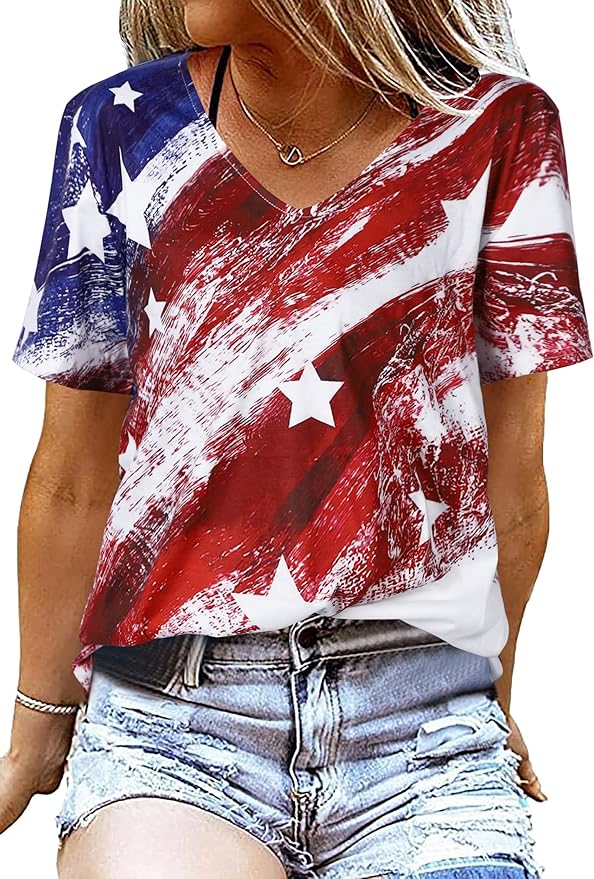 - Celebrate in comfort with our women’s USA flag V-neck tee. Made of soft, breathable polyester-spandex, it offers stretch and ease while showcasing a vibrant stars-and-stripes design.